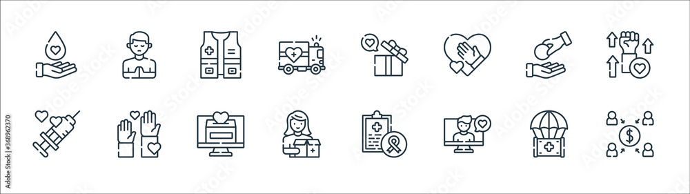 Kindness Line Icons Linear Set Quality Vector Line Set Such As Crowdfunding Video Call Donors Injection Generous Vest Gift Praying Stock Vector Adobe Stock